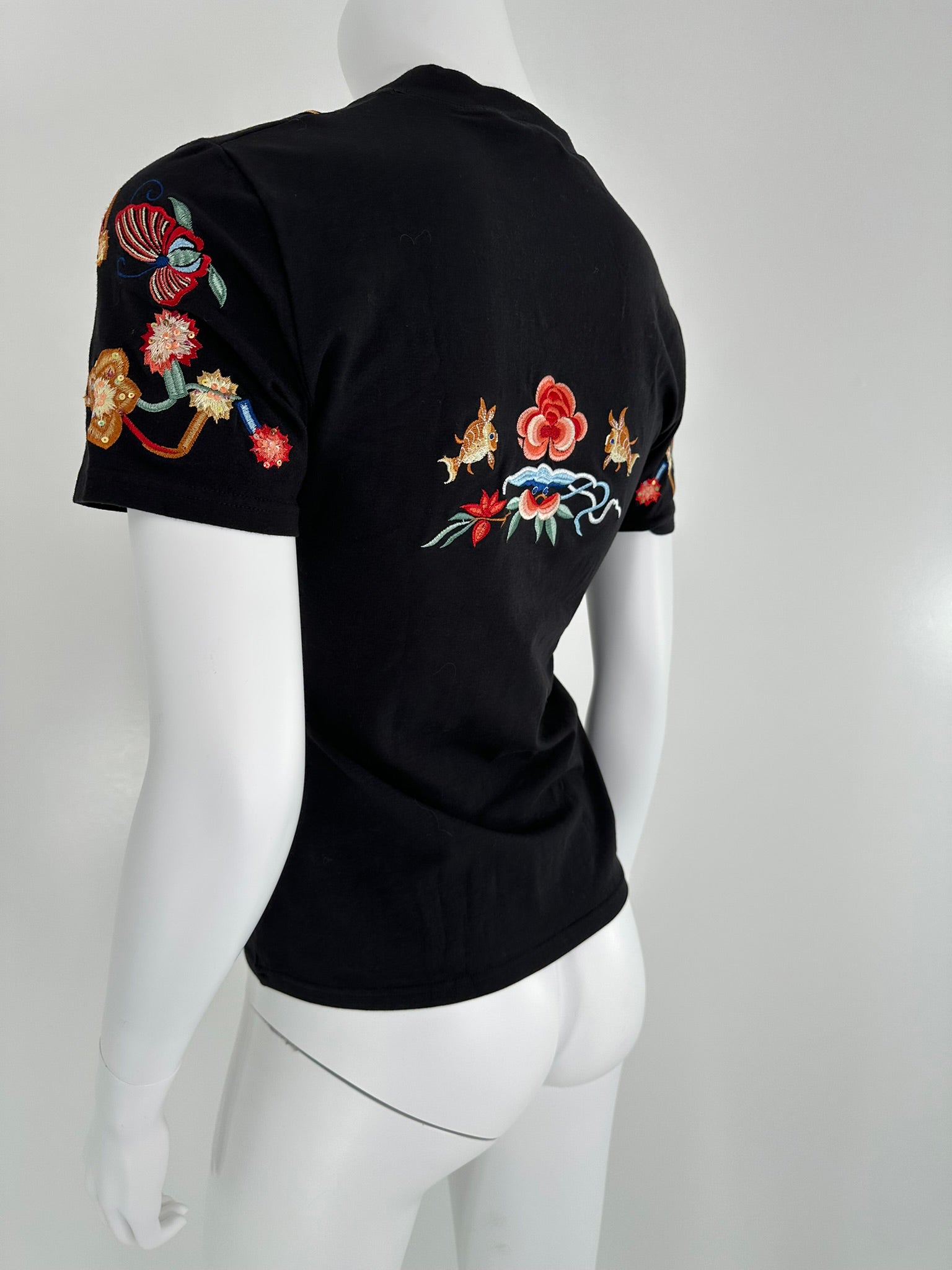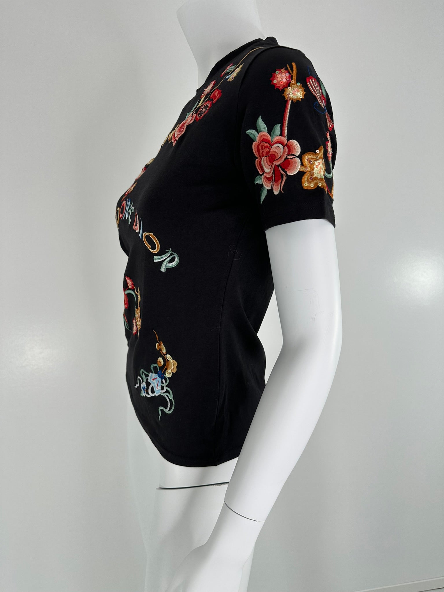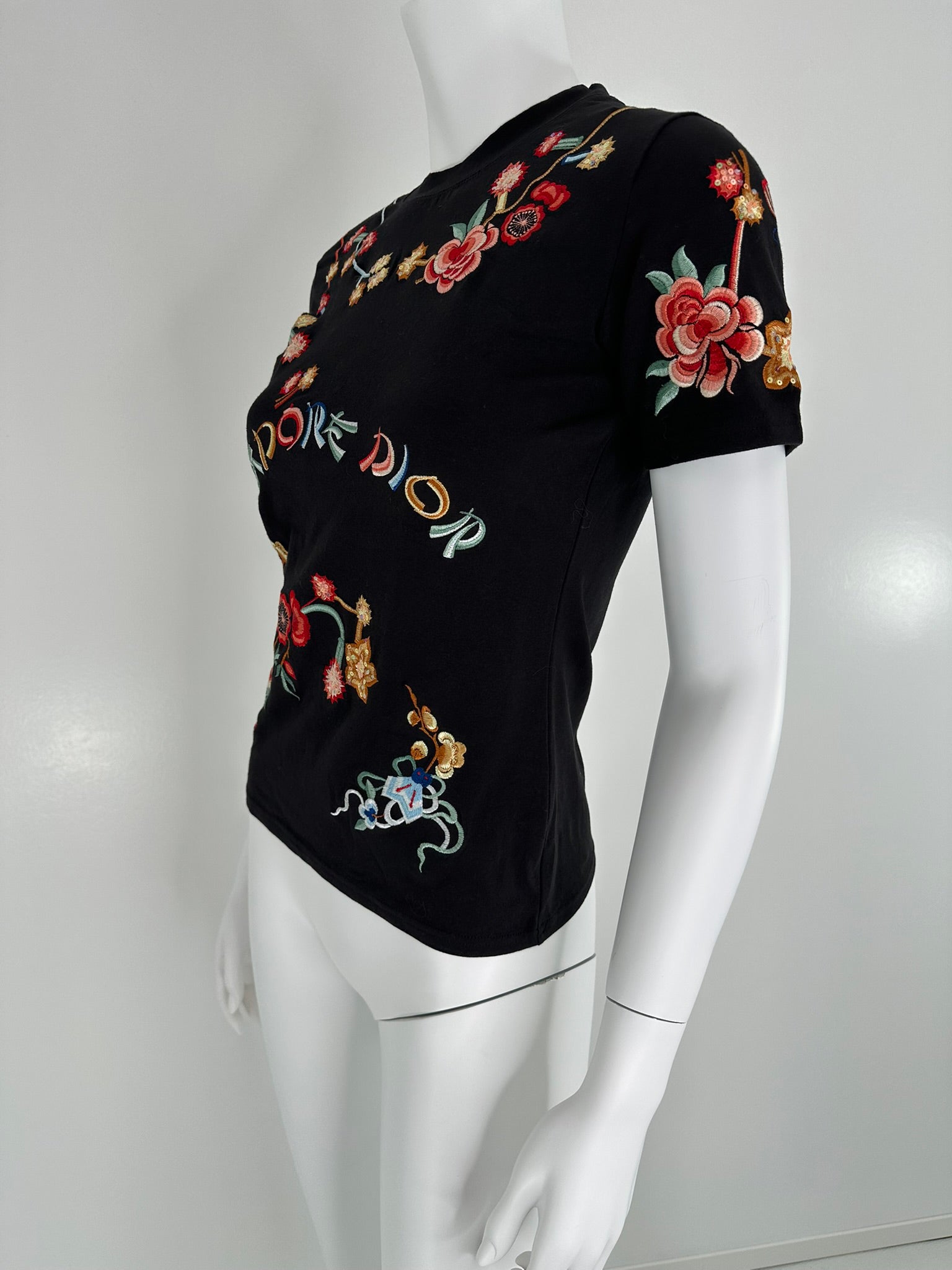 Christian Dior 2001 J'ADORE DIOR, black embroidered cotton short sleeve T-Shirt. Jewel neck, short sleeve T that is embroidered and sewn with sequins throughout the garment. The embroidery is done in an Asian style, J'ADORE DIOR is embroidered in an arc across the front, the embroidery is sewn with sequins. There is an embroidered motif at the upper center back. Marked US size 10, the shirt still has the original bag with extra sequins inside.