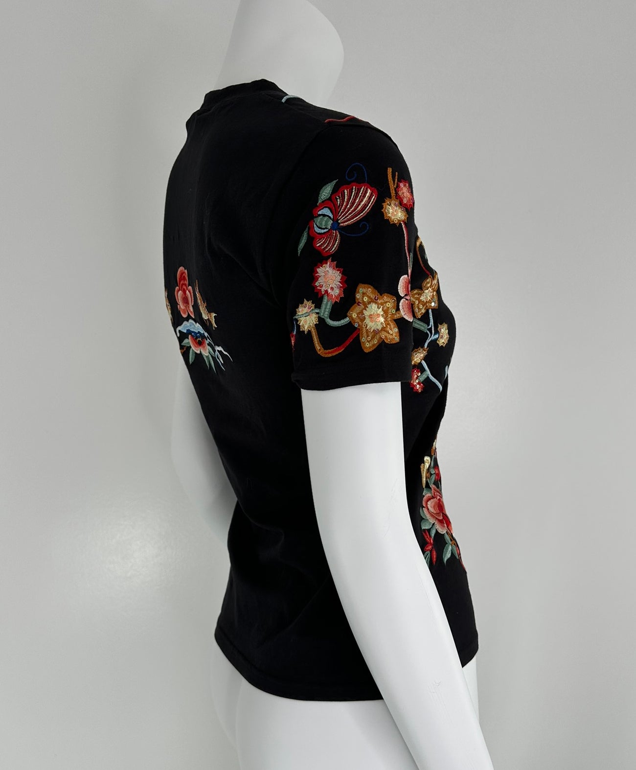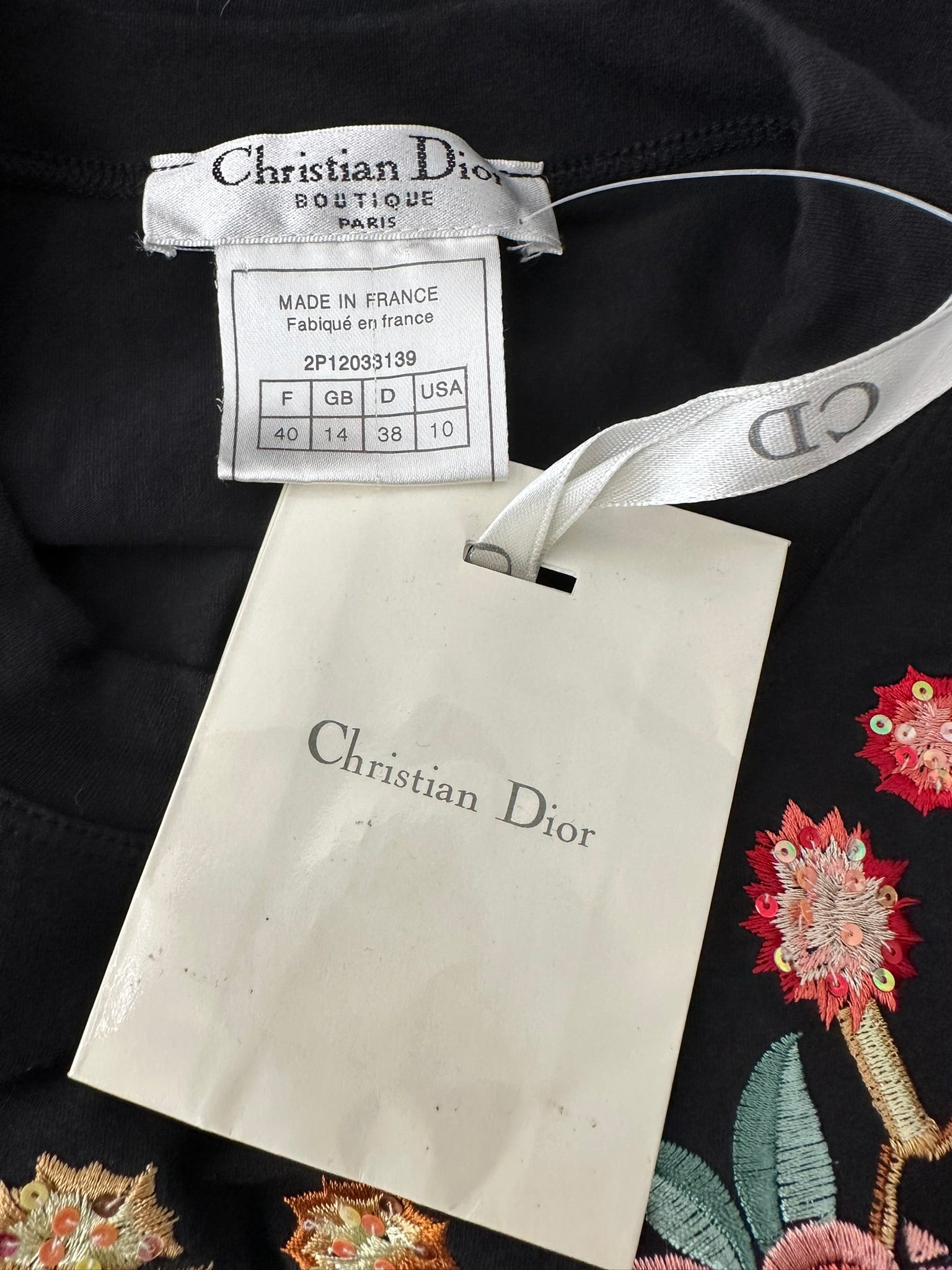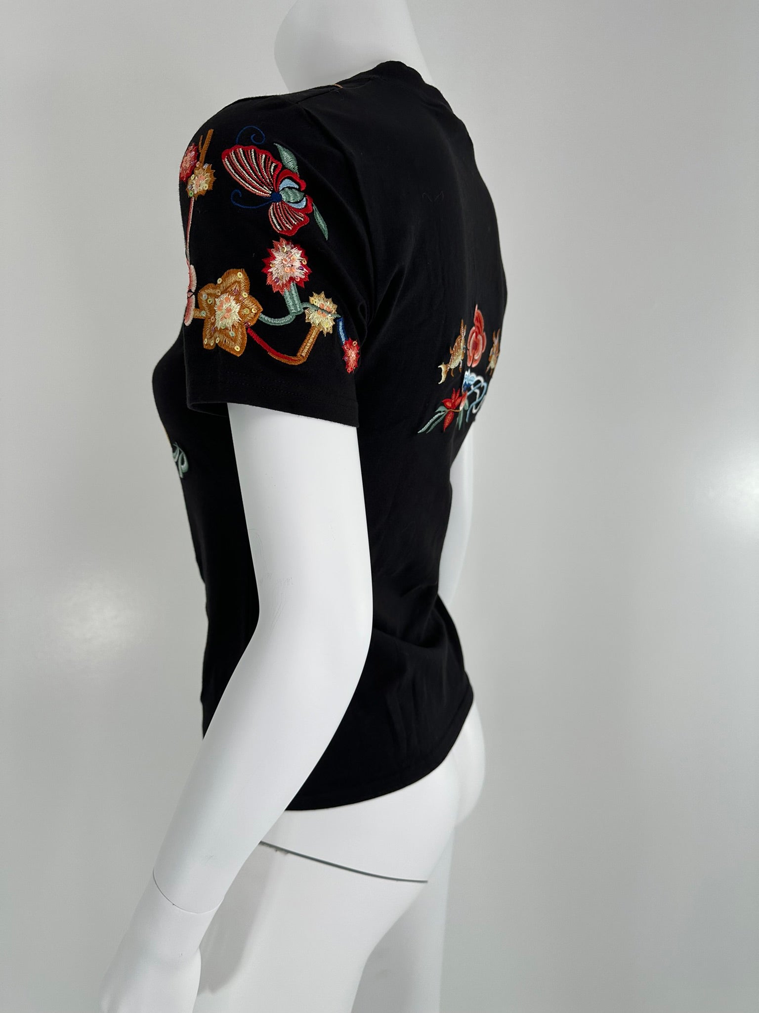 Christian Dior 2001 J'ADORE DIOR, black embroidered cotton short sleeve T-Shirt. Jewel neck, short sleeve T that is embroidered and sewn with sequins throughout the garment. The embroidery is done in an Asian style, J'ADORE DIOR is embroidered in an arc across the front, the embroidery is sewn with sequins. There is an embroidered motif at the upper center back. Marked US size 10, the shirt still has the original bag with extra sequins inside.