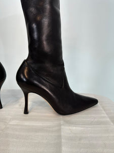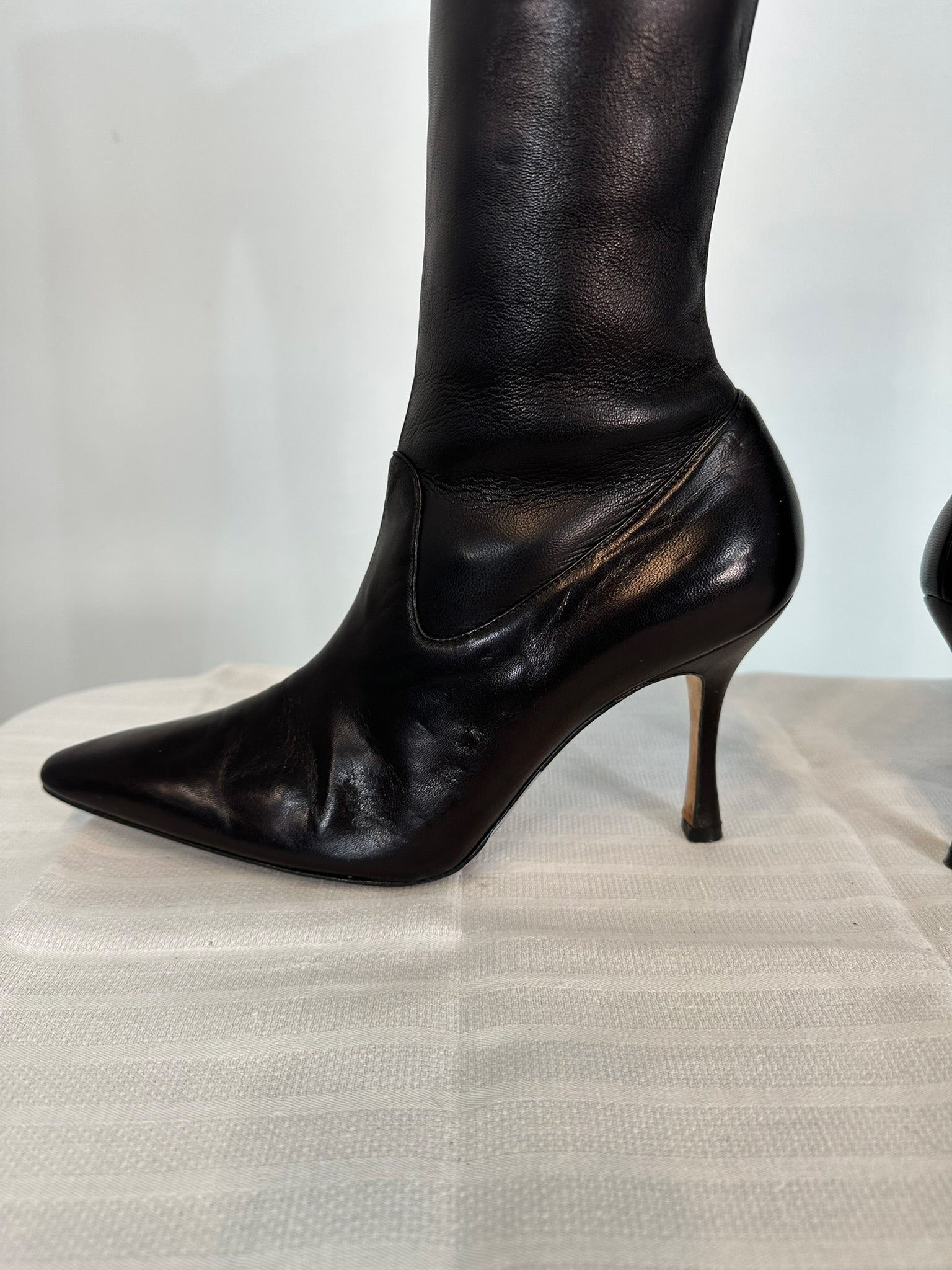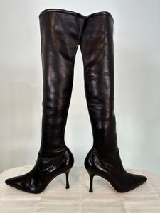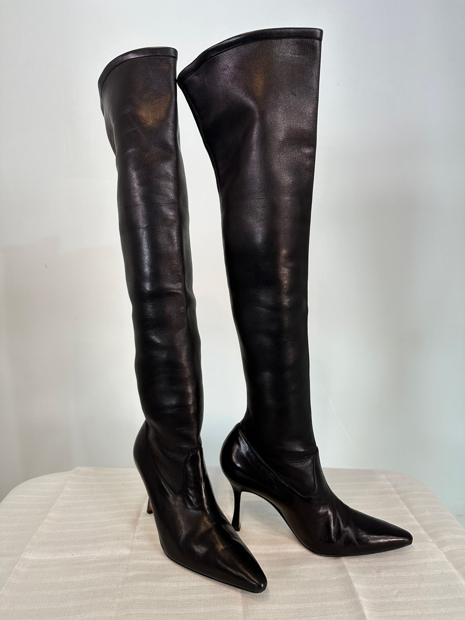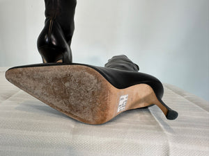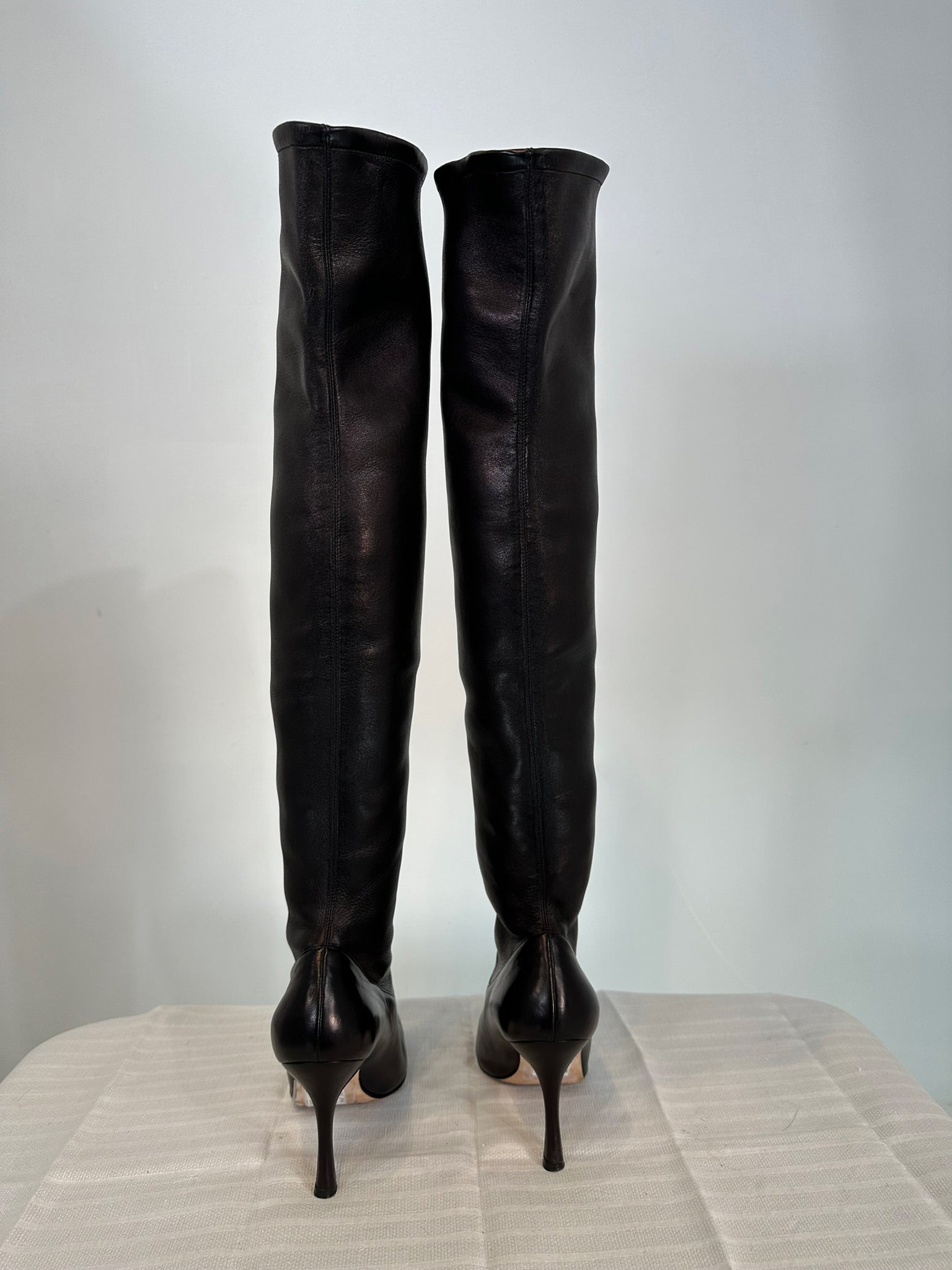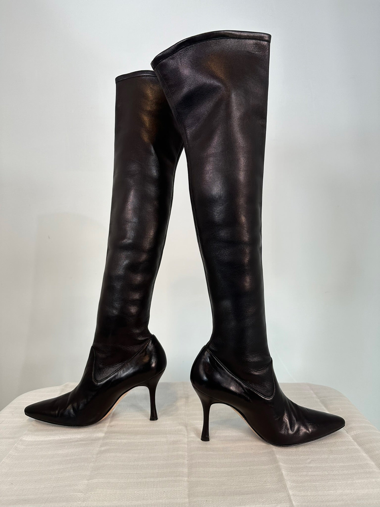 Manolo Blahnik over-the-knee boot fits like a glove in soft stretch black Nappa leather with pointed toe.