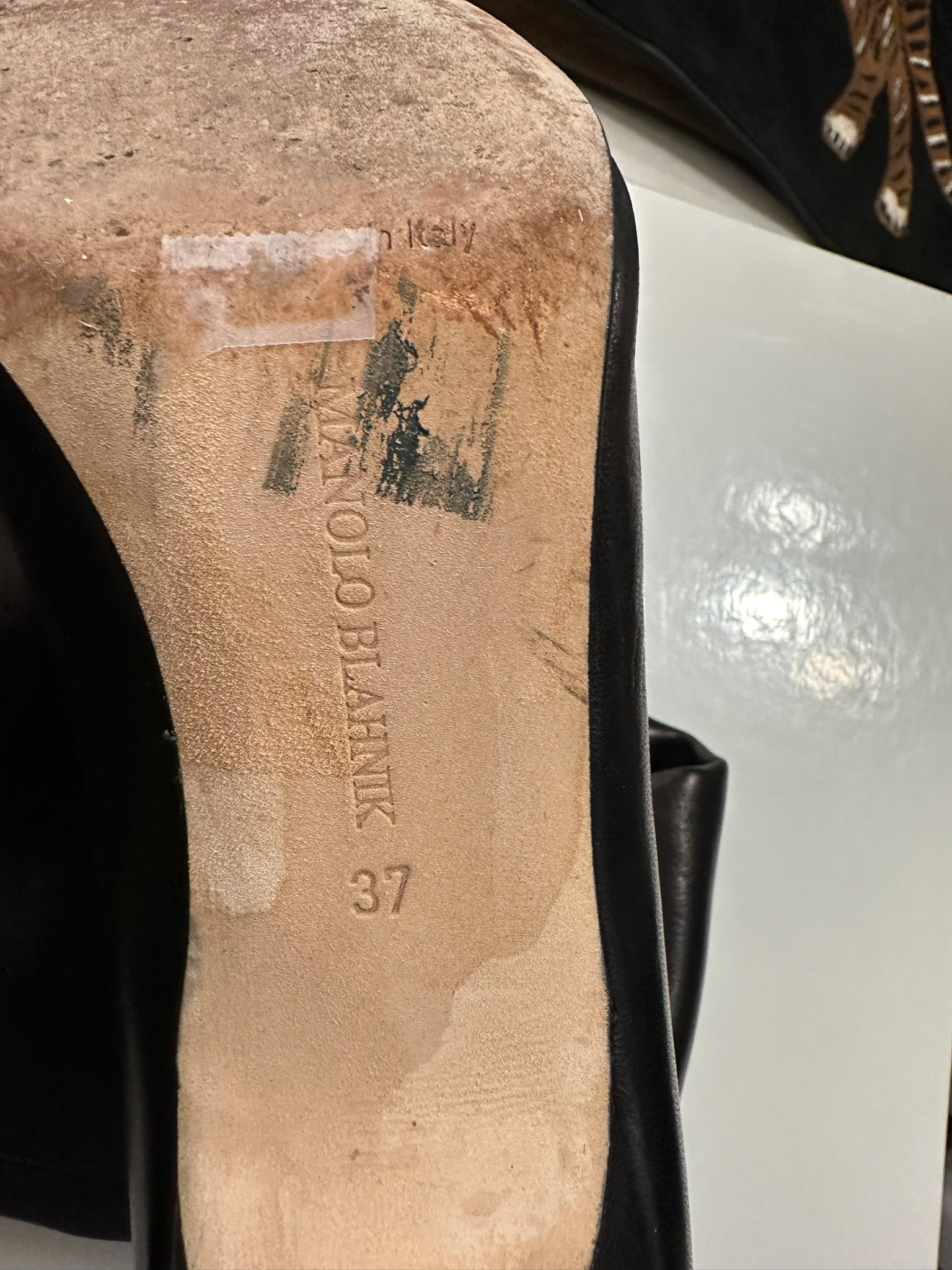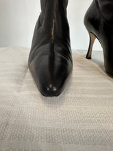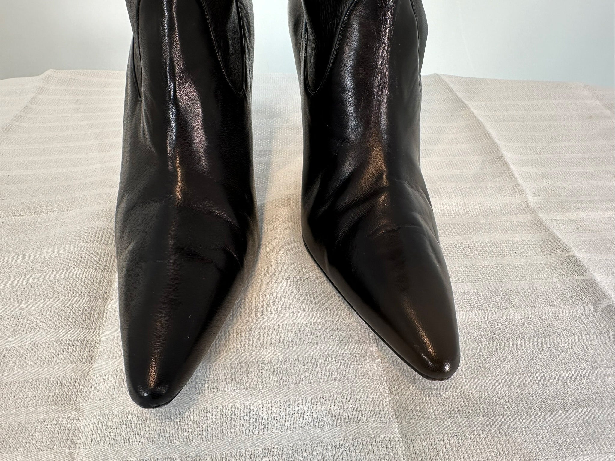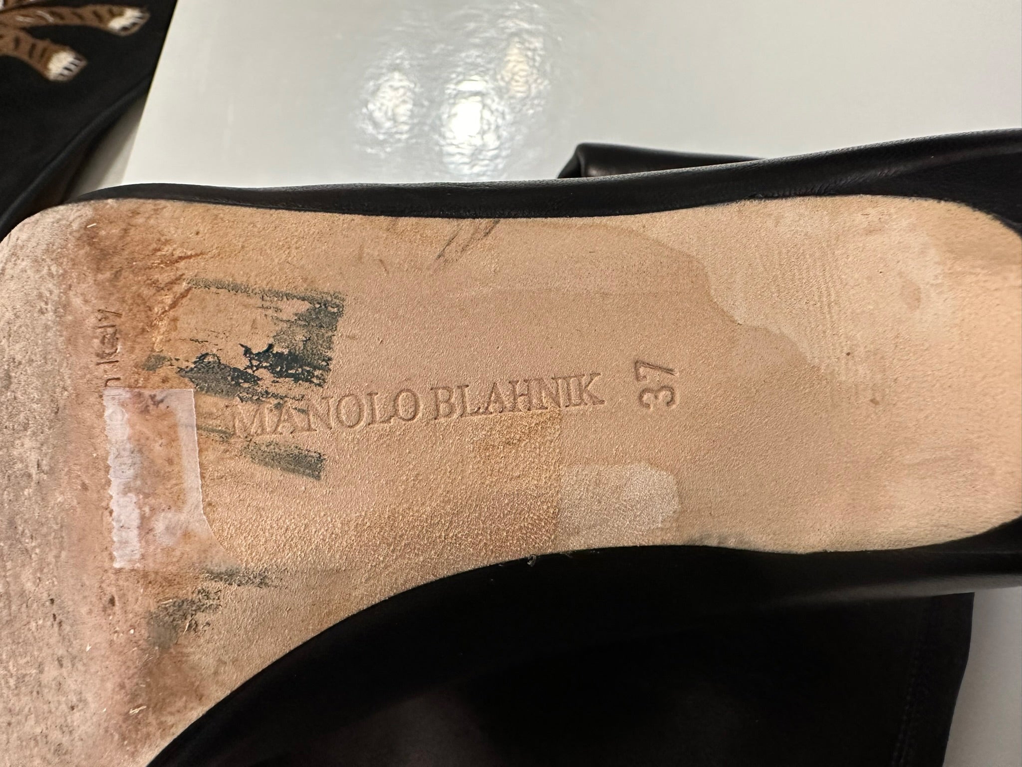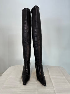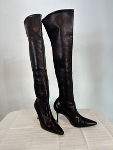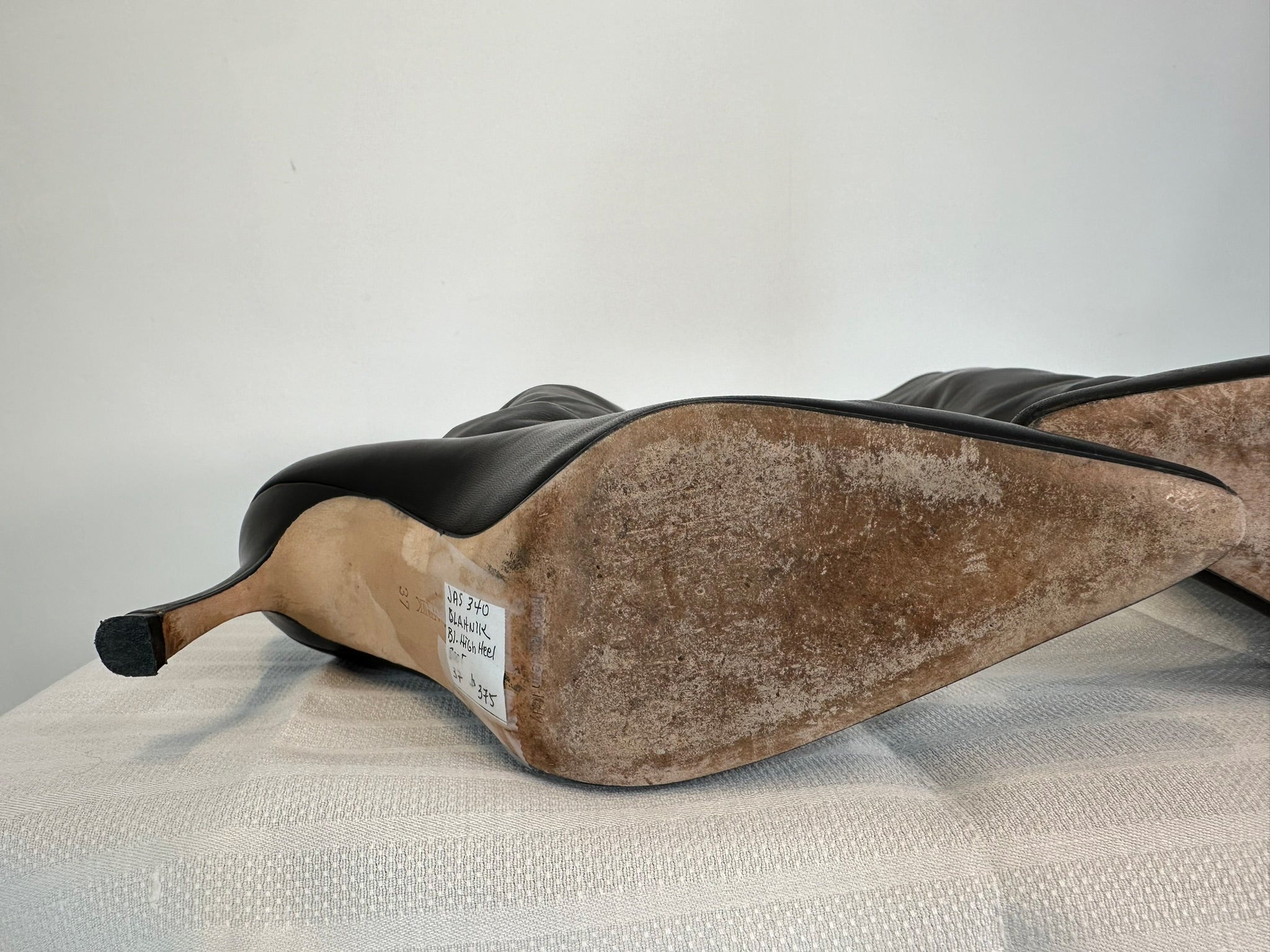 Manolo Blahnik over-the-knee boot fits like a glove in soft stretch black Nappa leather with pointed toe.